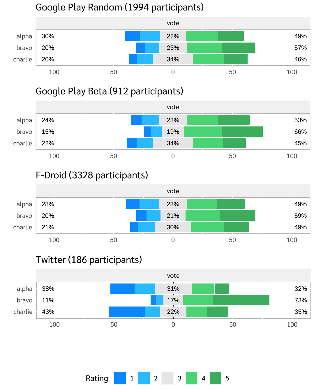 The survey was shared among different groups: Google Play Beta users, our Twitter followers, a random group of Google Play users, and our F-Droid users. For each of these groups we distributed another link to the poll. Below, you can see the rating distribution across different groups. For each group, the bravo proposal was rated best. You can also see the number of participants form each group.