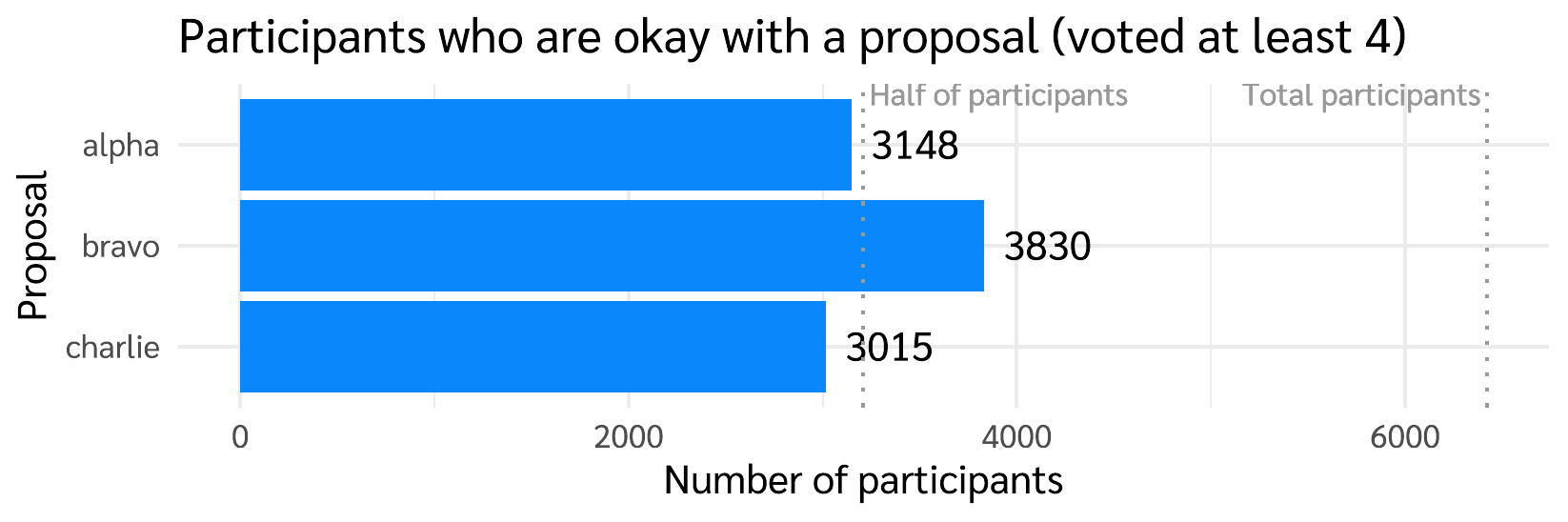 Apart from the total score we found it interesting to see how many users accept a proposal, even if it’s not their favourite. The plot below shows that 60% of the users generally like proposal bravo, while fewer than 50% like the other proposals.